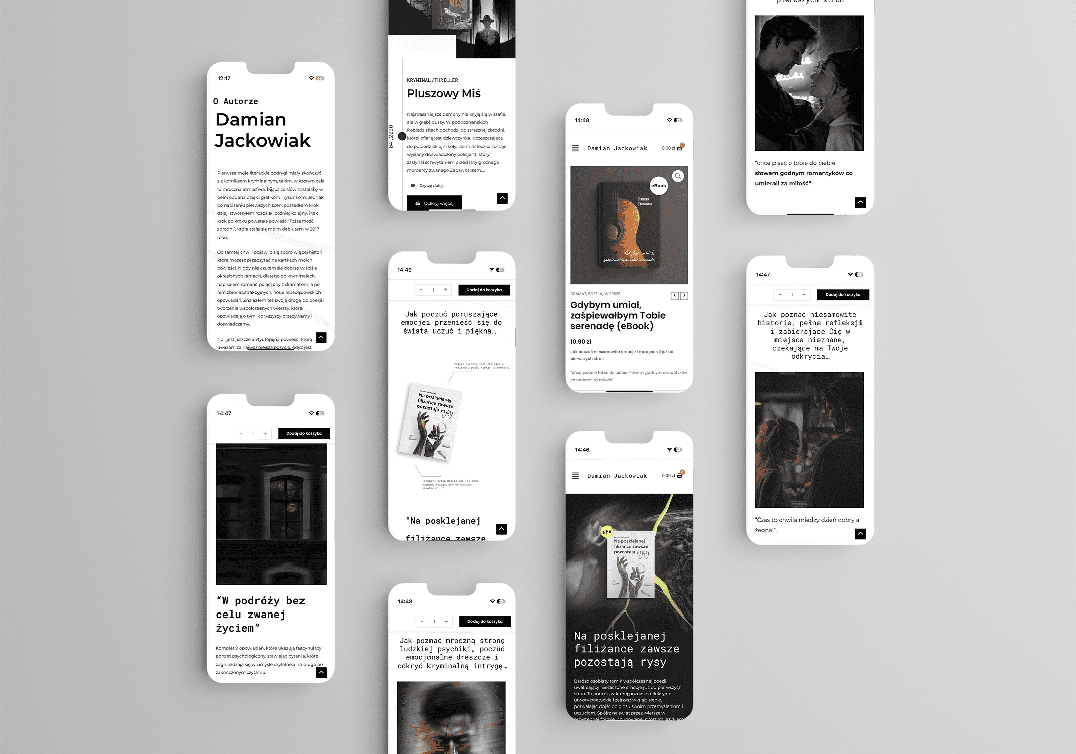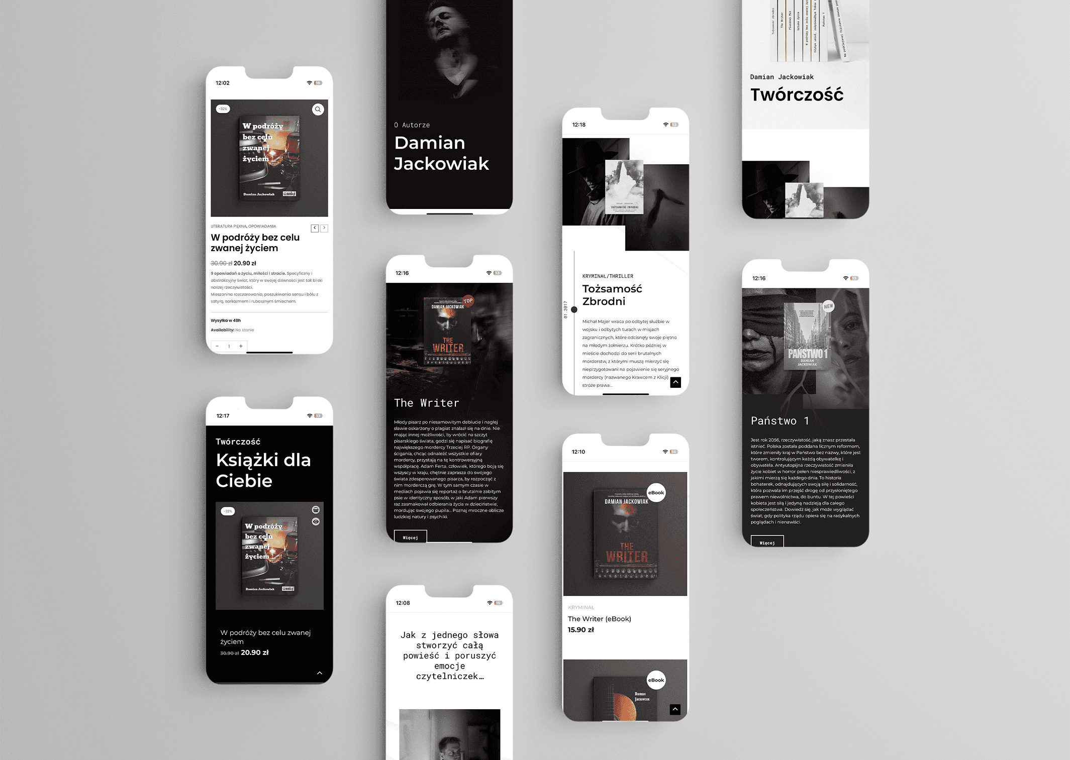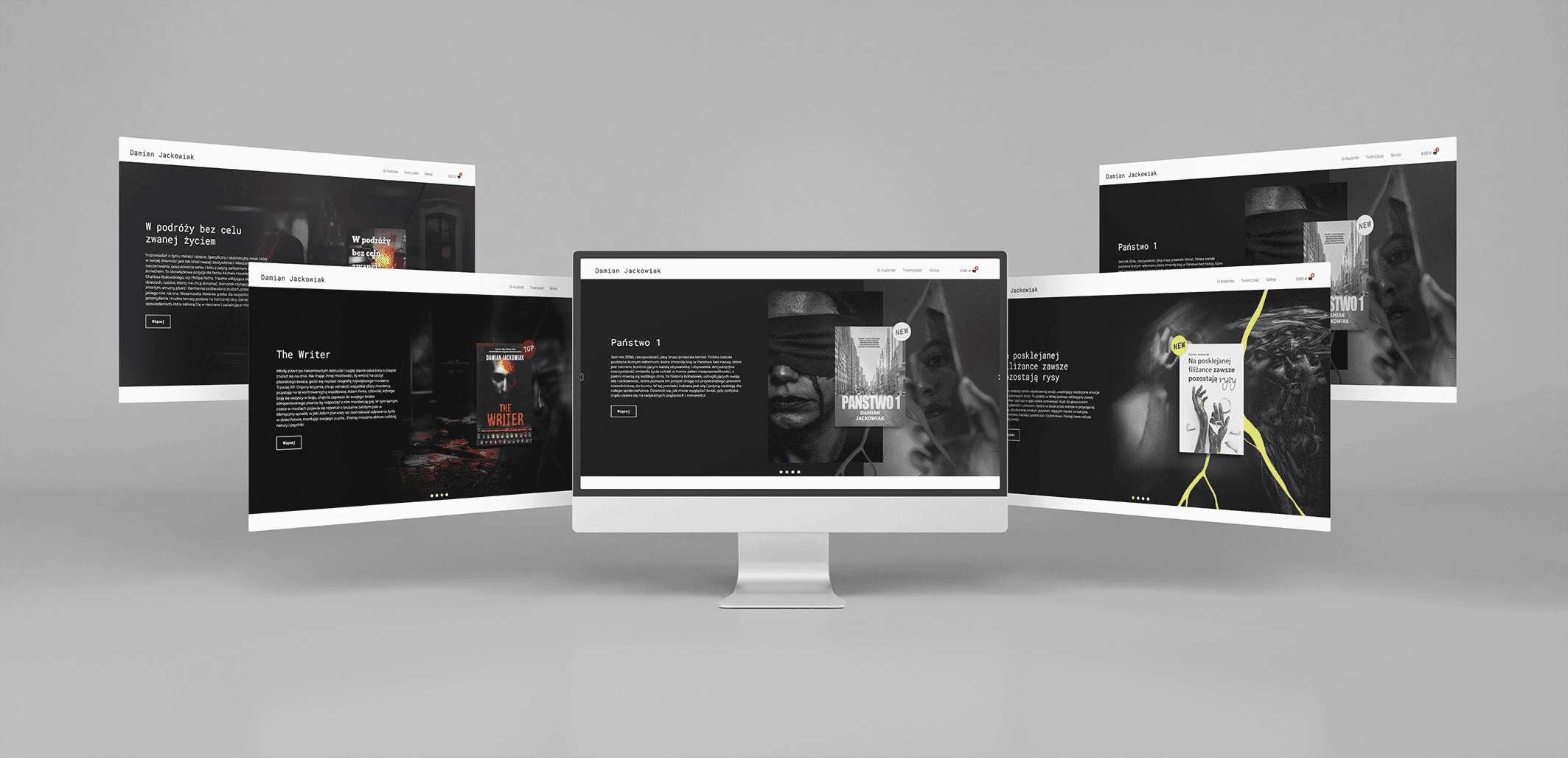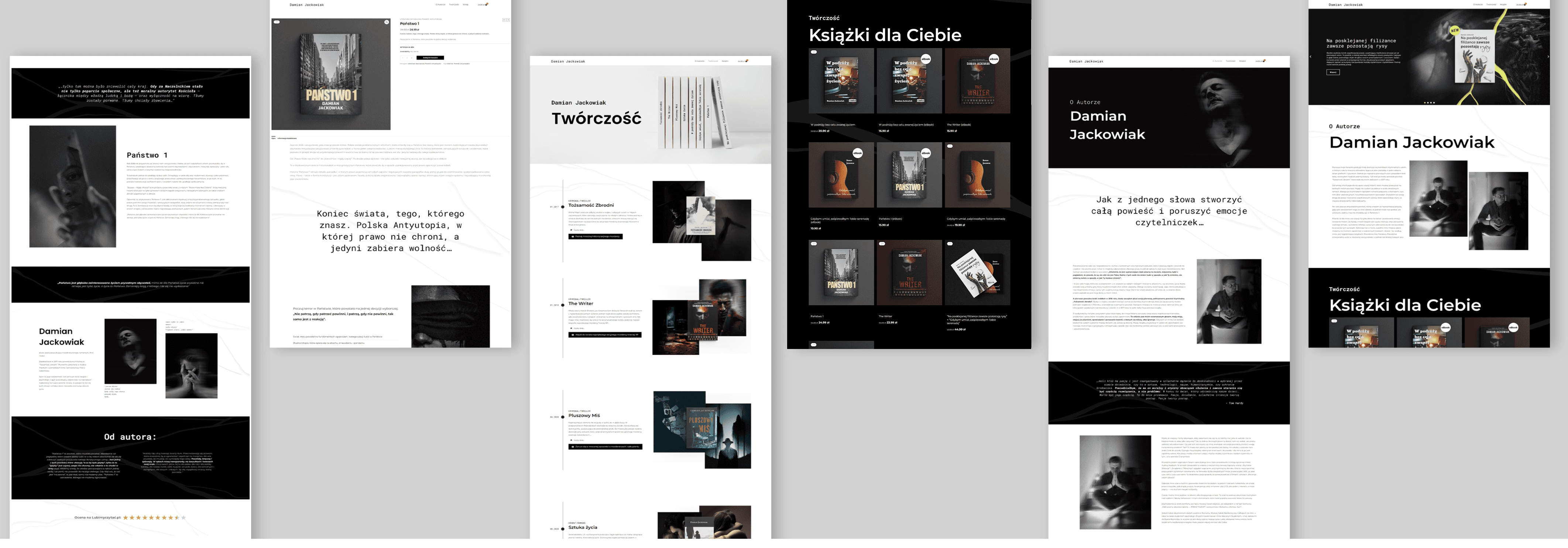 3. Inspiracja i podejście kreatywne Inspiracją dla projektu były same książki Damiana – ich tematyka, stylistyka oraz sposób, w jaki autor opowiada historie. Zależało mi na tym, aby strona wizualnie oddawała charakter każdej książki. Nie bazowałem na gotowych rozwiązaniach konkurencji – zamiast tego stworzyłem unikalną koncepcję, w której każda książka miała swój indywidualny Landing Page, immersyjnie wprowadzający użytkownika w jej klimat. 4. Proces projektowy Projekt został zrealizowany według następujących etapów: 1. Analiza konkurencji – wyciągnięcie najlepszych praktyk i znalezienie niszy wyróżniającej stronę. 2. Tworzenie struktury strony – opracowanie architektury informacji i makiet UX. 3. Projektowanie interfejsu – stworzenie unikalnych grafik, makiet wizualnych i oprawy wizualnej książek. 4. Implementacja na WordPress + WooCommerce – przełożenie projektu na funkcjonalną stronę internetową. 5. Optymalizacja i testy – sprawdzenie użyteczności strony, analiza wydajności i dopracowanie szczegółów. W trakcie realizacji największym wyzwaniem było spójne połączenie różnorodnych stylistyk okładek książek, które dominują na stronie. Rozwiązałem ten problem poprzez zastosowanie spójnych mockupów oraz dobranie podobnych tonacji kolorystycznych dla tła każdej książki. 5. Wdrożenie i efekty Strona została wdrożona jako oficjalna platforma sprzedażowa Damiana Jackowiaka. Dzięki temu autor przestał być zależny od wydawnictw i zaczął prowadzić samodzielną sprzedaż książek, eliminując prowizje pośredników. Działania marketingowe po wdrożeniu obejmowały kampanie reklamowe na Facebooku, które kierowały użytkowników na poszczególne Landing Page’e, optymalizując proces sprzedażowy. 6. Rezultaty i wnioski • Sukces w sprzedaży – Damian zyskał pełną kontrolę nad dystrybucją swoich książek i zwiększył swoje marże. • Nowoczesny wizerunek – strona odzwierciedla jego osobowość i charakter jego książek. • Lepsza interakcja z czytelnikami – użytkownicy mają bardziej immersyjne doświadczenie, co przekłada się na większe zaangażowanie. Projekt zakończył się pełnym sukcesem, a strona spełniła wszystkie założenia brandingowe i sprzedażowe.