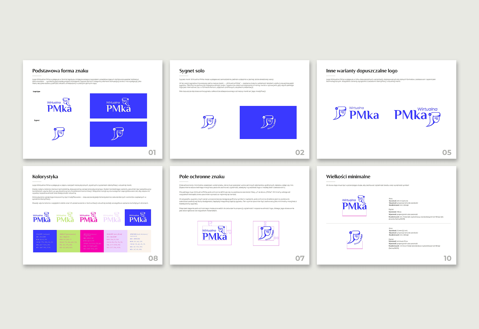 Wirtualna PMka to marka edukacyjna dla project managerów, której logo symbolizuje komunikację i dostępność – kluczowe wartości w zarządzaniu projektami. Sygnet przedstawia kobiecą sylwetkę z głową w formie dymku konwersacyjnego, nawiązując do dialogu, edukacji i pracy zespołowej. Check przy głowie to znak realizacji i dostępności – sugerujący skuteczność, gotowość i inkluzywność. Kolorystyka łączy nowoczesność z energią – od głębokiego niebieskiego po magentę i zieleń. Typografia bazuje na kontrastowym zestawieniu delikatności z siłą – podkreślając równowagę między miękkimi kompetencjami a twardą wiedzą. Logo i system identyfikacji zostały zaprojektowane z myślą o digitalu – czytelne, elastyczne i gotowe na social media.